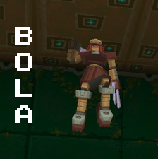 Bola stands still (unguarded), and after a few seconds he makes a mighty leap, crashing down on your current location with his blade. This isn't too hard to avoid, as you can simply run around to throw off his aim. The attack does leave a small shock-wave, though, so be sure not to stray too close!